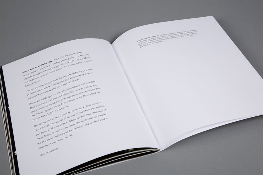 After the inauguration of the 45th President of the United States, Jason Lazarus created dozens of hand-painted photograms, each with the phone number of the White House written quickly and gesturally, like a protest sign, for his bookwork 202 456-1111. This special edition from 2018 includes a 7.5 x 90 inch accordion folded piece and 7.5 x 9 inch, 40 page saddle-stitched book, screen-printed envelope.