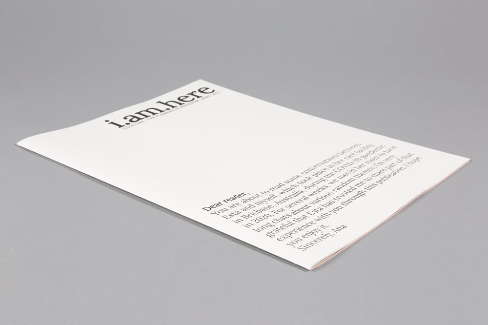 I Am Here is a periodical publication that aims to create dialogue and connectedness between aged-care residents and the rest of the community. Issue One, The Flowers in Her Room, features conversations between Brisbane-based artist Ana Paula Estrada and Esta Ziviani, which took place in a care facility in Brisbane, Australia, during COVID-19 pandemic in 2020. This is the first of six issues published periodically by VSW Press. Copies will be available for free at selected aged-care facilities, and for sale here.