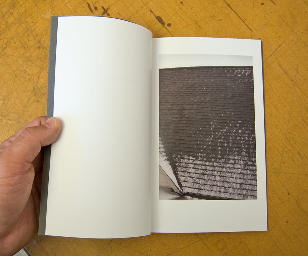 "Looking Backward is about the act of looking and being involved in a quiet meditation on change. The images were captured everyday through a sash cord window during the early parts of the Rochester winter. The snow on the roof mimics text on a page – creating patterns that emerge, similar to when you look at a page from a novel and squint your eyes a little." RD