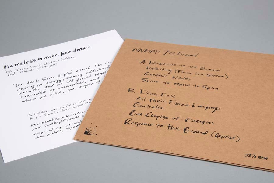 Includes 12" LP. Ambient electronic recording with analog tape manipulation by the band namelessnumberheadman in response to the book The Ground. Jacket design by Tate Shaw and hand-screenprinted by Hey Buddy! in Rochester, NY. Limited edition of 200.